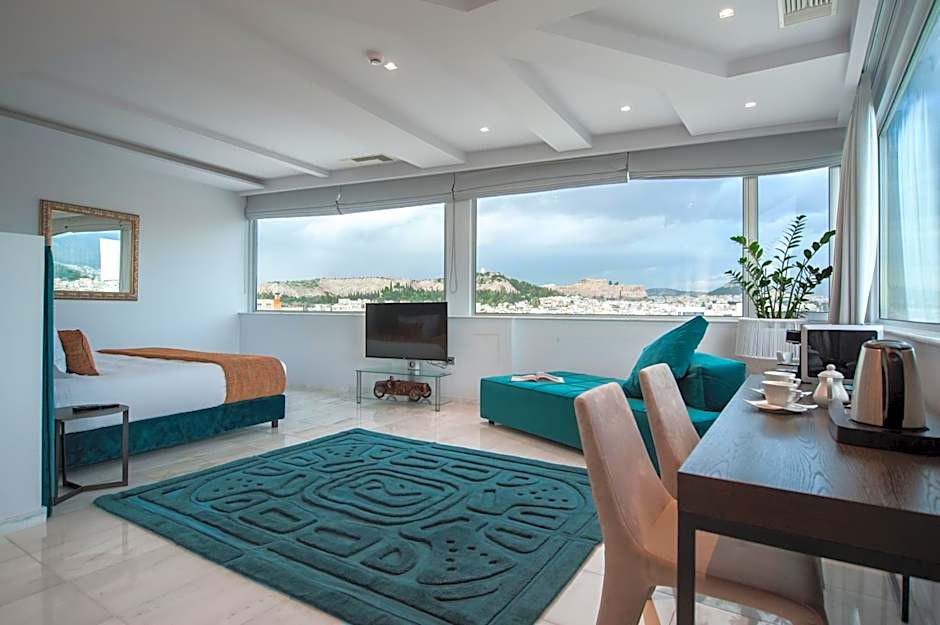 Elegantly decorated suite with a seating area and a modern bathroom with shower cabin. Facilities include air conditioning, a flat-screen TV, hairdryer and free toiletries. Some units offer views over the Acropolis.